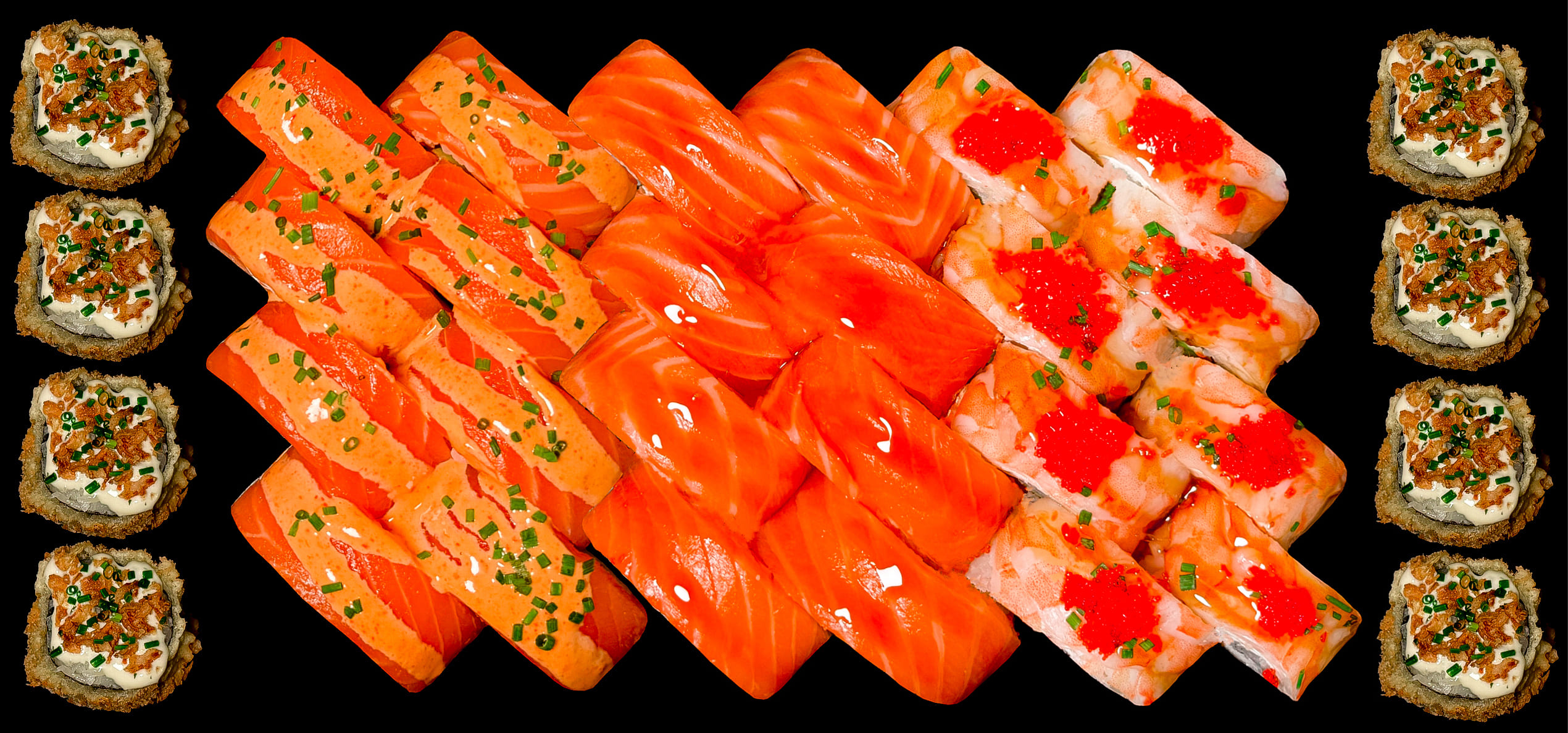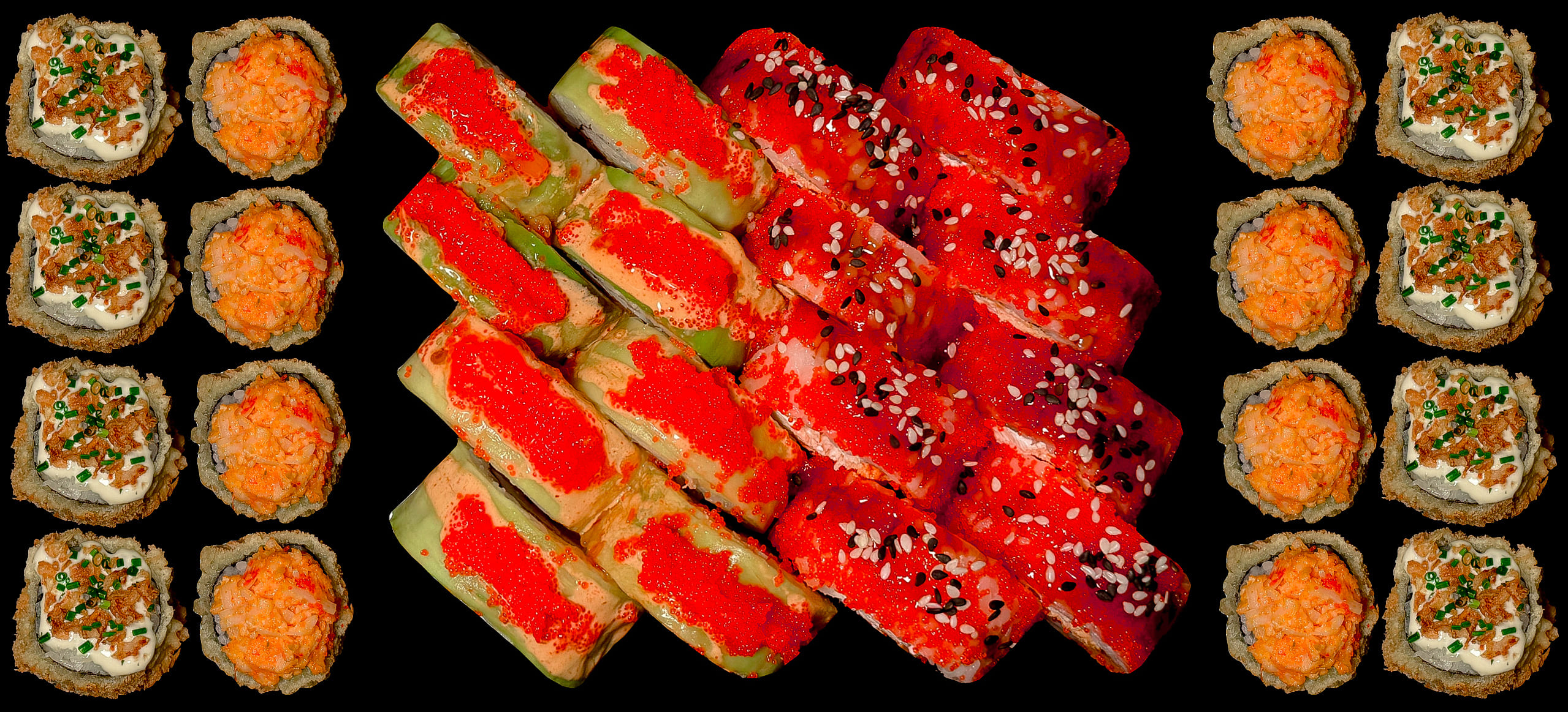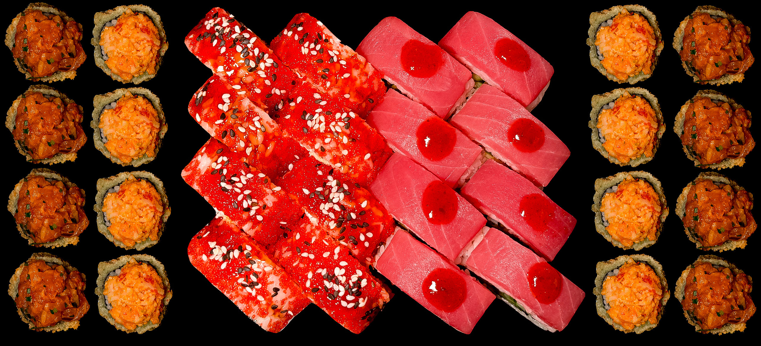 Tempura ebi crunch (czosnkowa) 8 szt. / Tempura tartar 8 szt. / Philadelphia spicy crunch 8 szt. / Ebi boom crunch (rolka z krewetką) 8 szt.