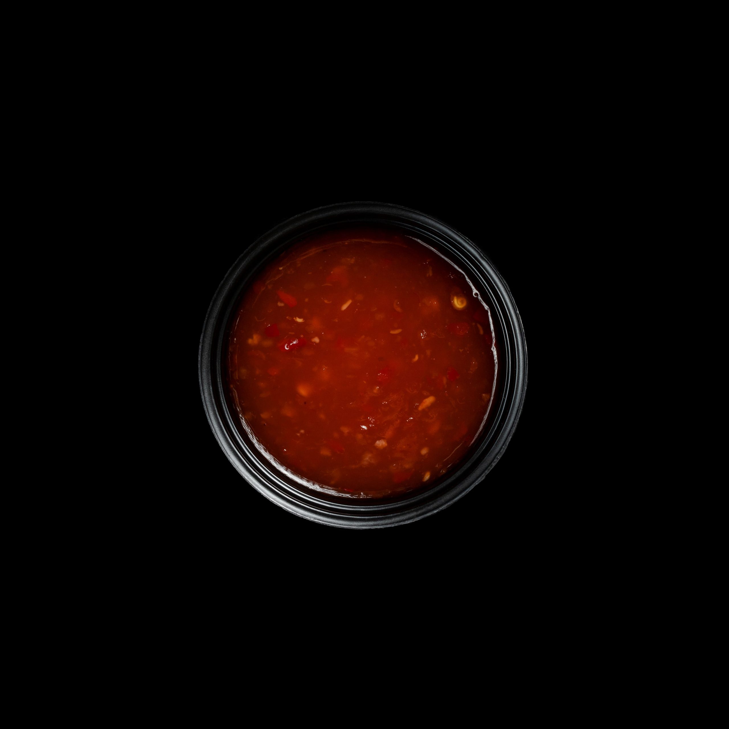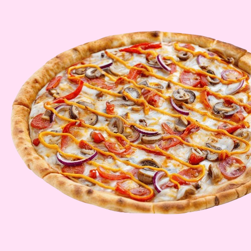 Чесночный соус, сыр моцарелла, пепперони, колбаска, лук красный, перец красный, шампиньоны, соус спайси.