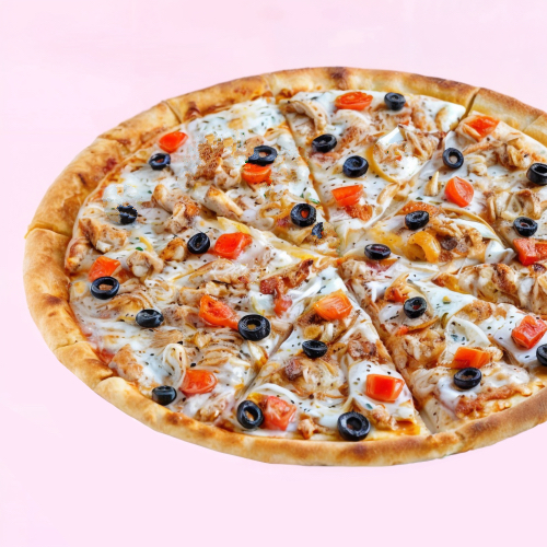 Чесночный соус, сыр моцарелла, куриное филе, помидоры, маслины, сушёный базилик.