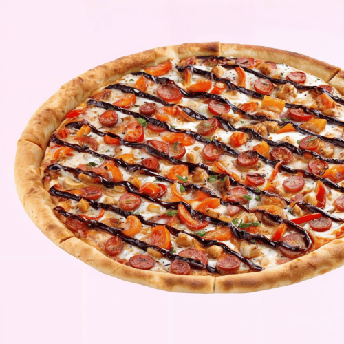 Соус томатный, сыр моцарелла, колбаски, помидоры, красный перец, лук красный, сушёный базилик, соус барбекю