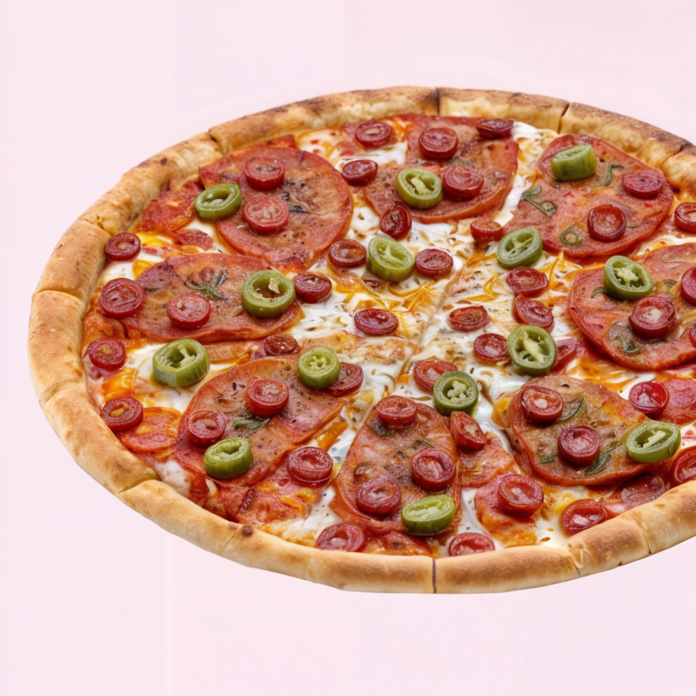 Томатный соус, сыр моцарелла, колбаски, пепперони, перец халапеньо, сушёный базилик.