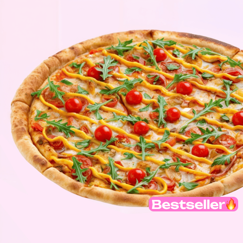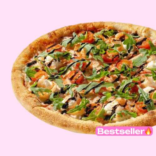 Помидорный соус, сыр моцарелла, черри, огурец консервированный, куриное филе, рукола, cоус чеддер.