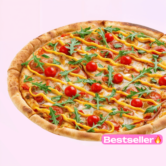 Sos pomidorowy, ser mozzarella, pomidorki cherry, ogórek konserwowy, kurczak, rukola, sos cheddar.